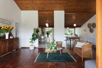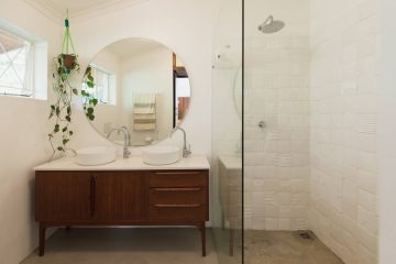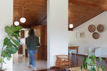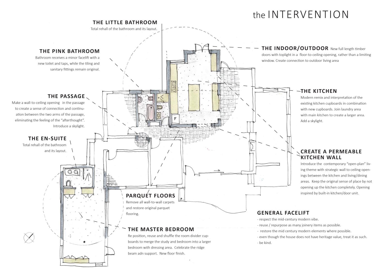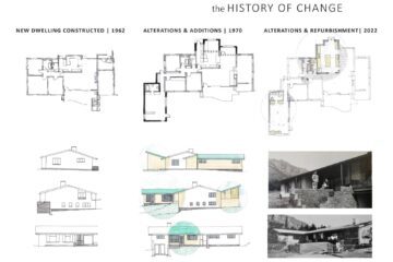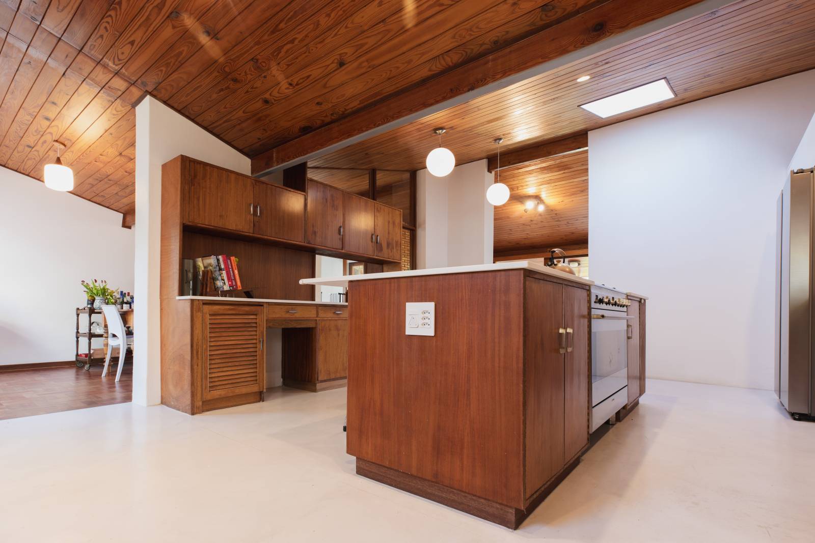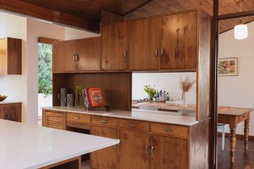 A 1960s home is given a new lease on life with small design interventions. The brief as very simple: keep true to the mid century modern style of the house yet at the same time modernising it for today’s family. The next constraint was to reuse as many of the existing joinery and fittings. Although the house is not a “master piece’ of mid century design ( particularly from the outside), the interiors speak somewhat differently. What ensued was a close working collaboration with the owners – a blurred line between interior design intervention and architectural elements. The main layout change is the introduction of the contemporary “open-plan” living theme with strategic wall to ceiling openings between the kitchen and living/dining areas. Keep the original sense of place by not opening up the kitchen completely. These new openings are inspired by built-in kitchen/door unit. And the glass toplights of one of the bedroom doors.