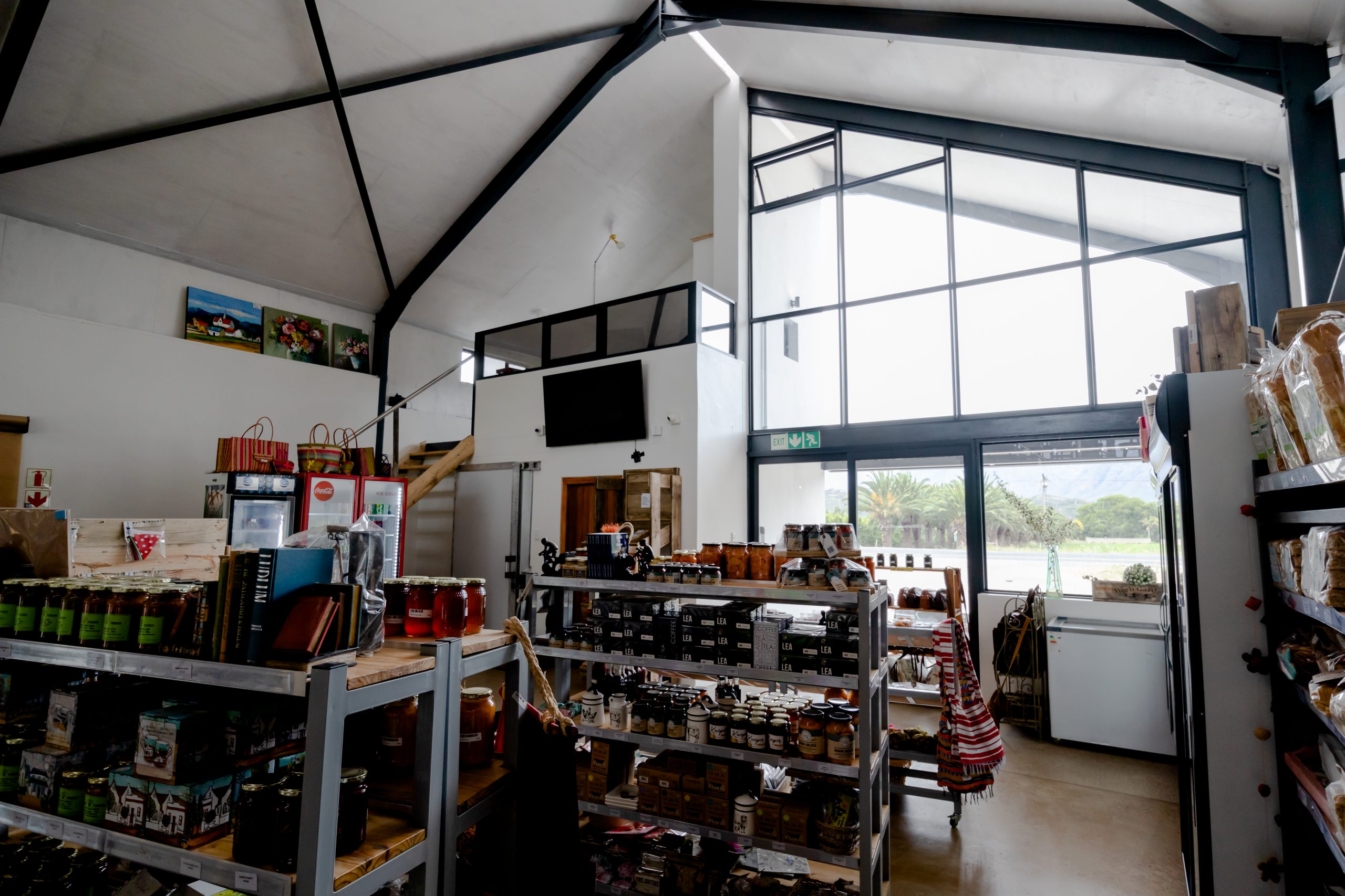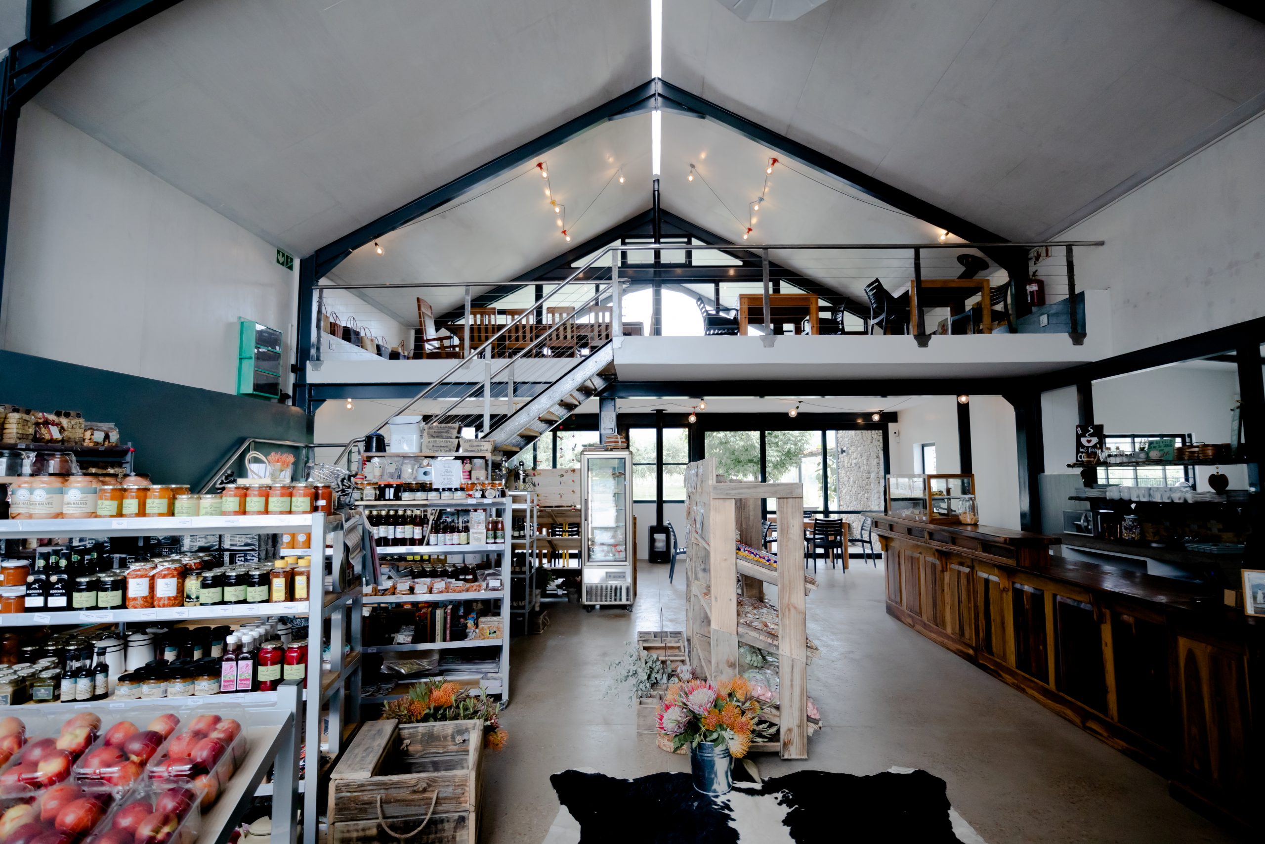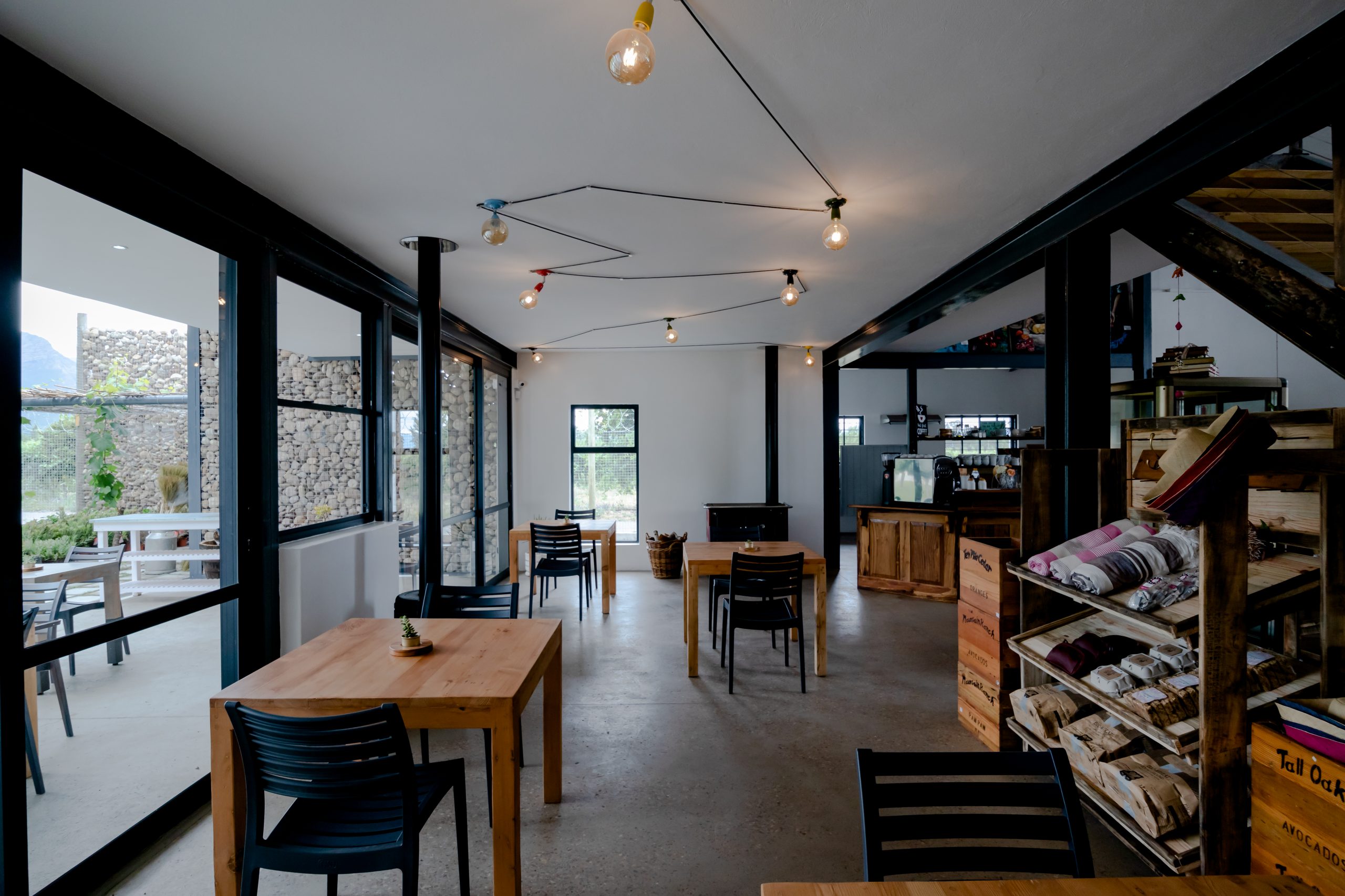 Set between the Witzenberg and Slanghoek mountains, the building is snuggled between vineyards, gumtrees and the R43 road. The double volume steel “shed” structure forms the core of the building: uninterrupted and clean space for the farm stall and restaurant, as the “wet services” have been pushed out to the flanks. The kitchen leads off from the long serving counter and the bathrooms are placed on the opposite side, accessed from the stoep. This allows for uninterrupted wall space for shop displays and mountain views through the full-length windows set back at the gable ends of the building. This functionality meets passive design principles and helps create a green and sustainable building.
